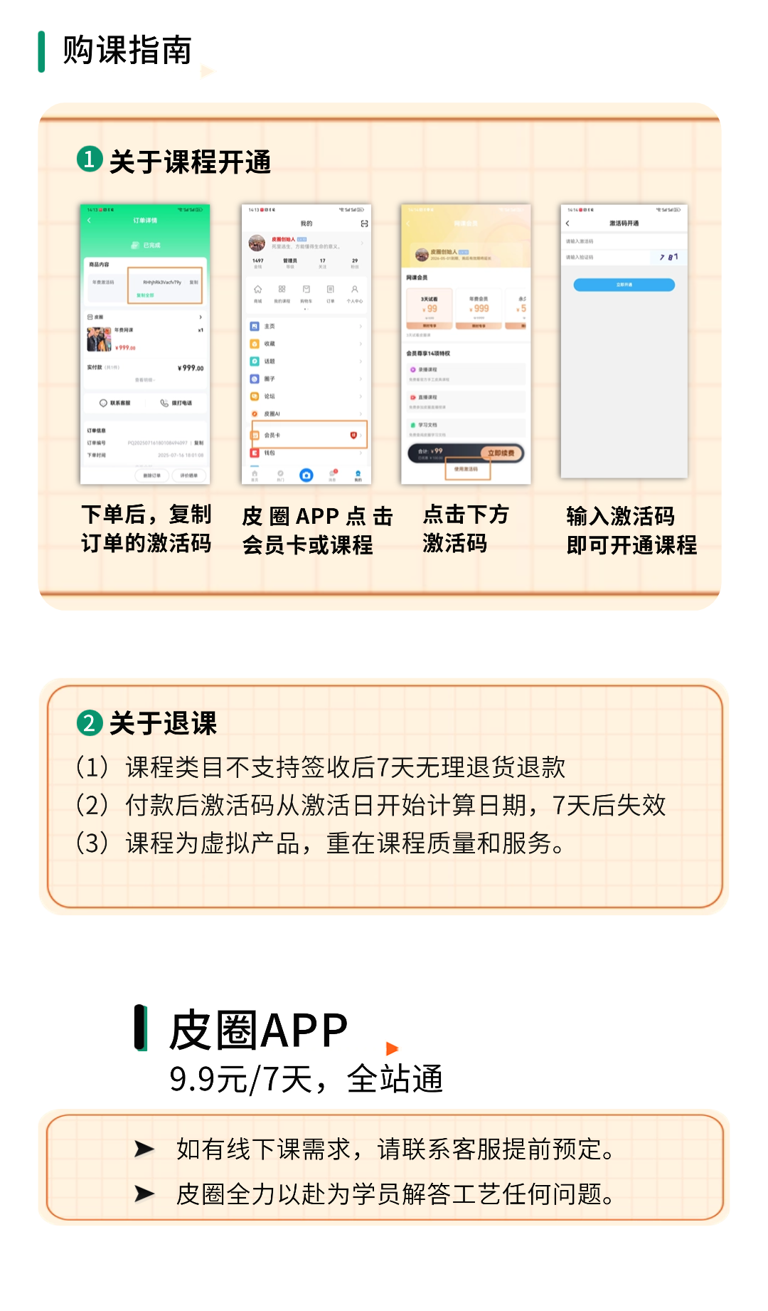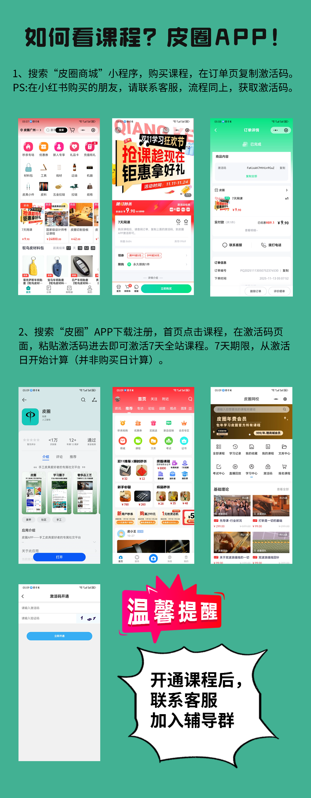 购买课程后,请查阅订单,复制上面的激活码,到皮圈APP激活即可。